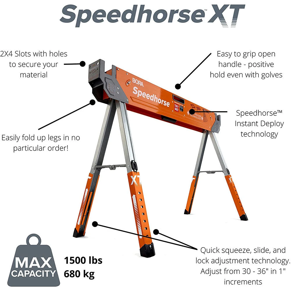 - The Bora PM-4550T XT Adjustable Height Speedhorse – 2 PK is designed to provide a sturdy and reliable workspace for all your tool and equipment needs. These heavy-duty saw horses are perfect for any job site or workshop.