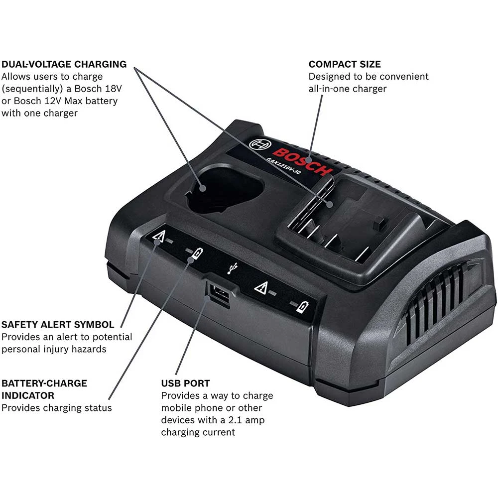 - Built with Bosch’s advanced technology, the GAX1218V-30 features intelligent charging that protects your batteries from overcharging, overheating, and short circuits.