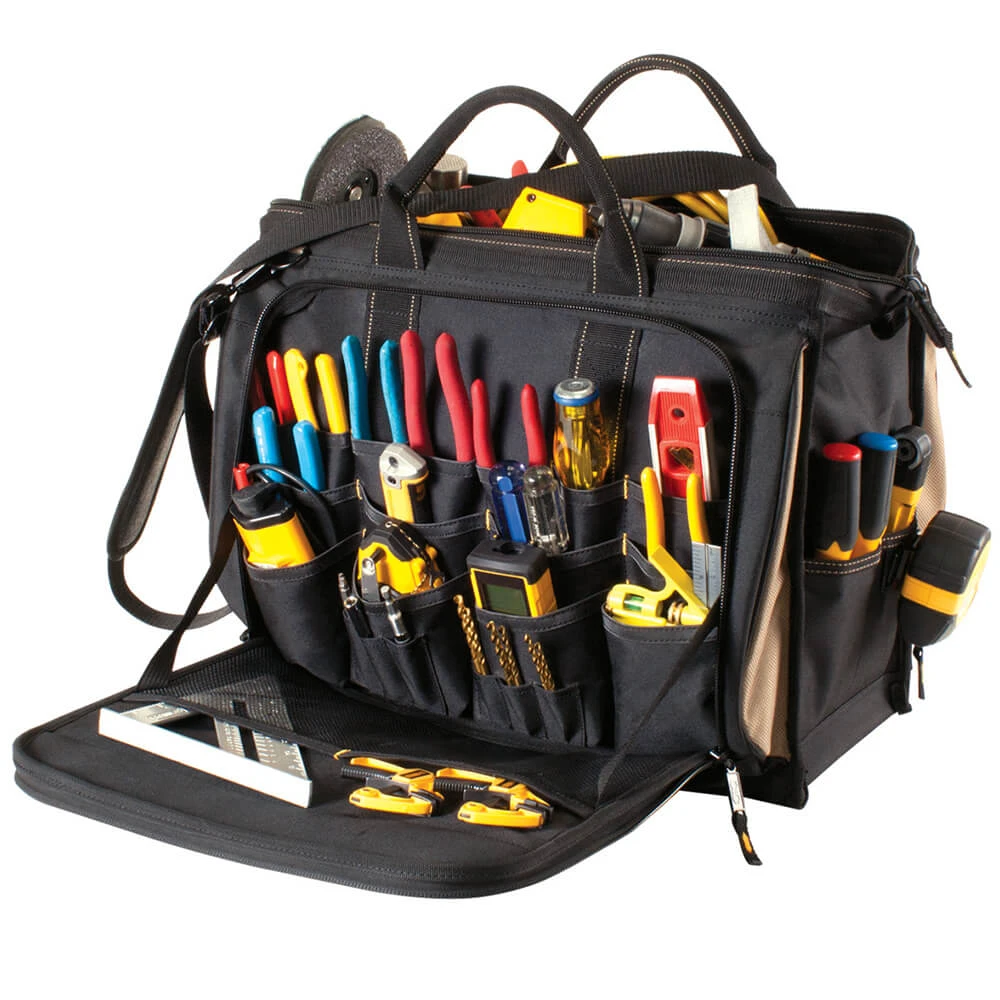 - Our very popular multi-compartment tool carrier with an extra large center compartment for power tools and two zippered side panels with 58 pockets for all your favorite hand tools, has padded handles and an adjustable shoulder strap.