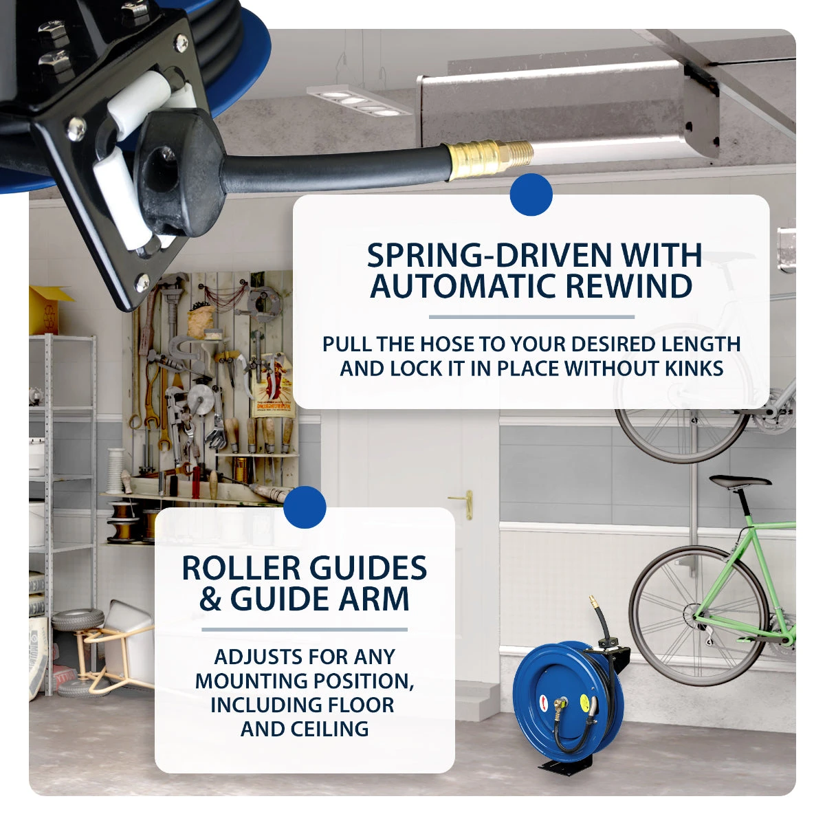 - 4-WAY ROLLER GUIDES and GUIDE ARM: For easy operation and to reduce wear on the hose; adjusts for any mounting position, including floor, wall, and ceiling