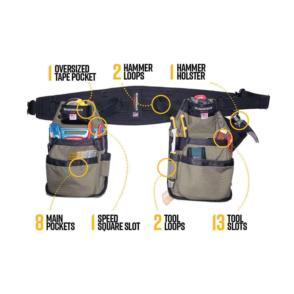 - With multiple pockets and compartments, the Diamondback DB5-11-OV-M Tool Belt keeps your tools organized and easily accessible, enhancing your efficiency on the job.