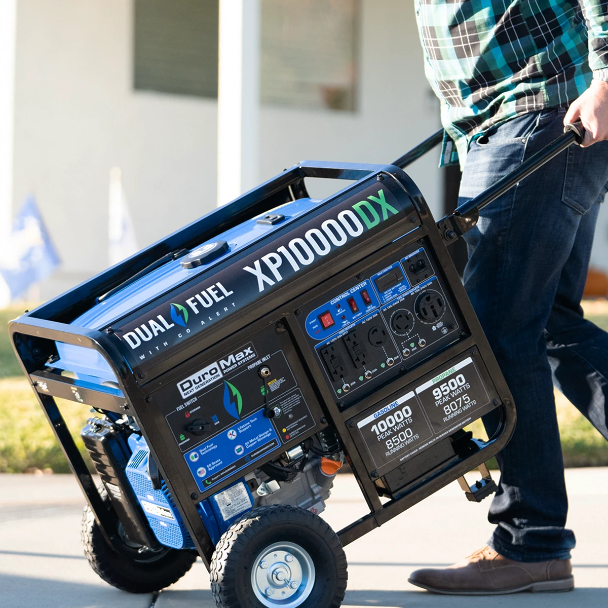 The XP10000DX is the most VERSATILE Dual Fuel generator of our new lineup, with 10,000 peak watts and 8,500 running watts. Powered by our DuroMax 420cc OHV engine, this generator is PERFECT for HOME POWER BACKUP and will run your household essentials such as lights, appliances, and central AC system with EASE during a blackout, storm, or emergency event.