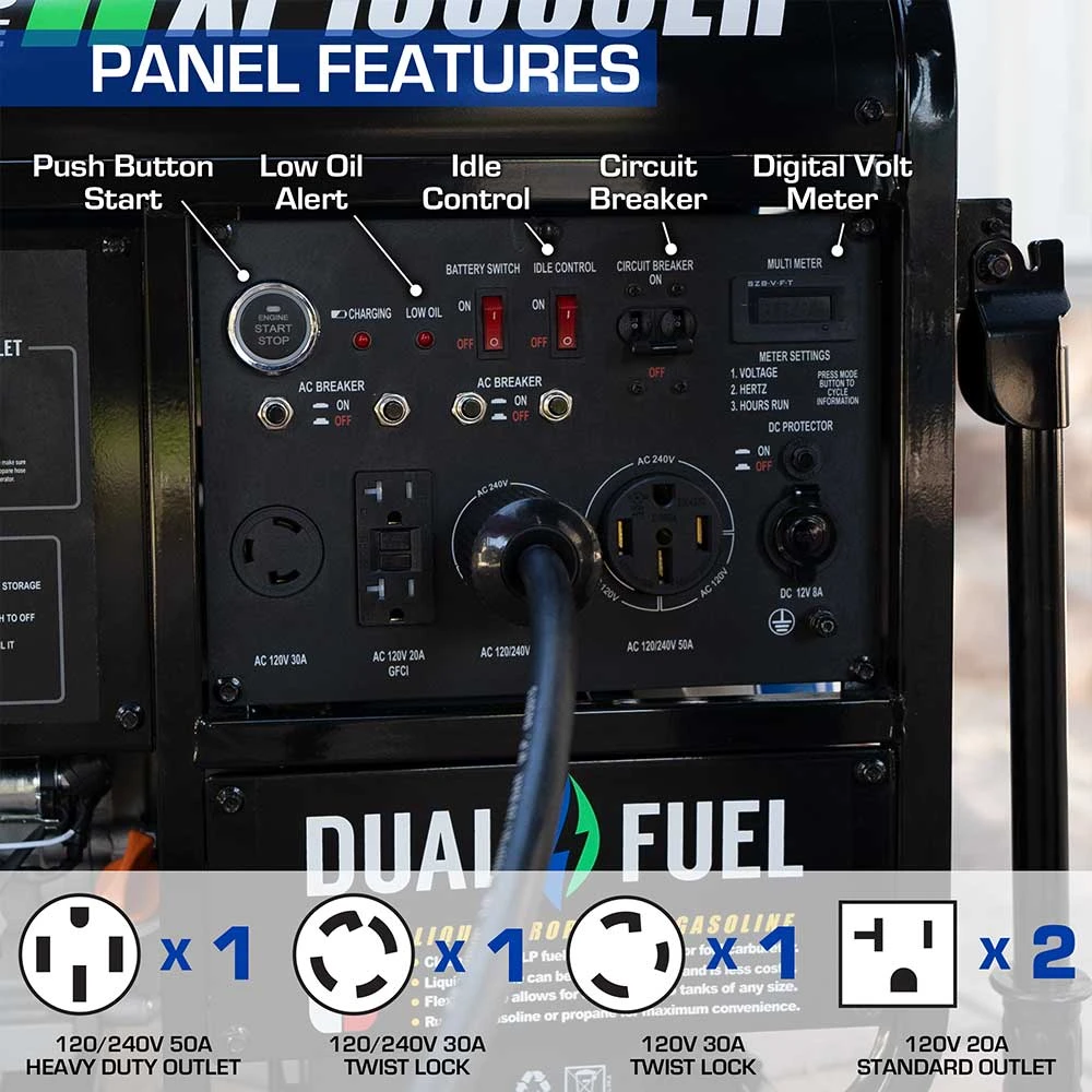The DuroMax XP13000EH is a Dual Fuel workhorse powered by a 500cc OHV Engine and runs on gasoline or propane. This unit provides the power normally found in stationary home standby units but in a portable package. With 10,500 watts of running power and the ability to surge up to 13,000 watts, this generator can power household essentials such as lights, small and large appliances, and your home’s central A/C system. The fully loaded power panel features multiple outlets including 2 120V GFCI protected household outlets, and individual breakers to prevent overloading and keep everything safe. This unit is both EPA and CARB approved for operation in all 50 states.