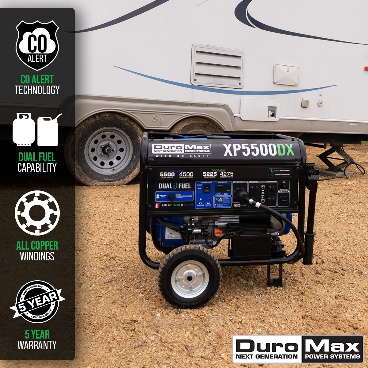 Our XP5500DX packs a punch with 5,500 peak watts and 4,500 running watts of compact Dual Fuel power. Powered by our 224cc DuroMax engine, this generator is excellent for camping, RVs, power on the jobsite, and will run various household essentials such as lights and appliances when the power goes out.