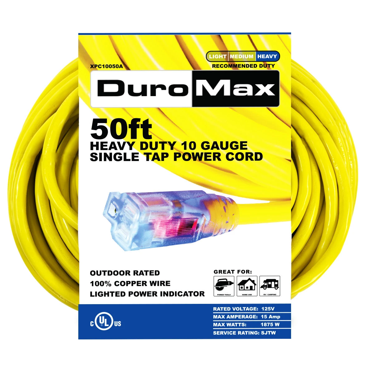 - Ensure reliable power transfer with the DuroMax XPC10050A 50-Foot 10 Gauge Single Tap Extension Power Cord, designed for heavy-duty generator use.