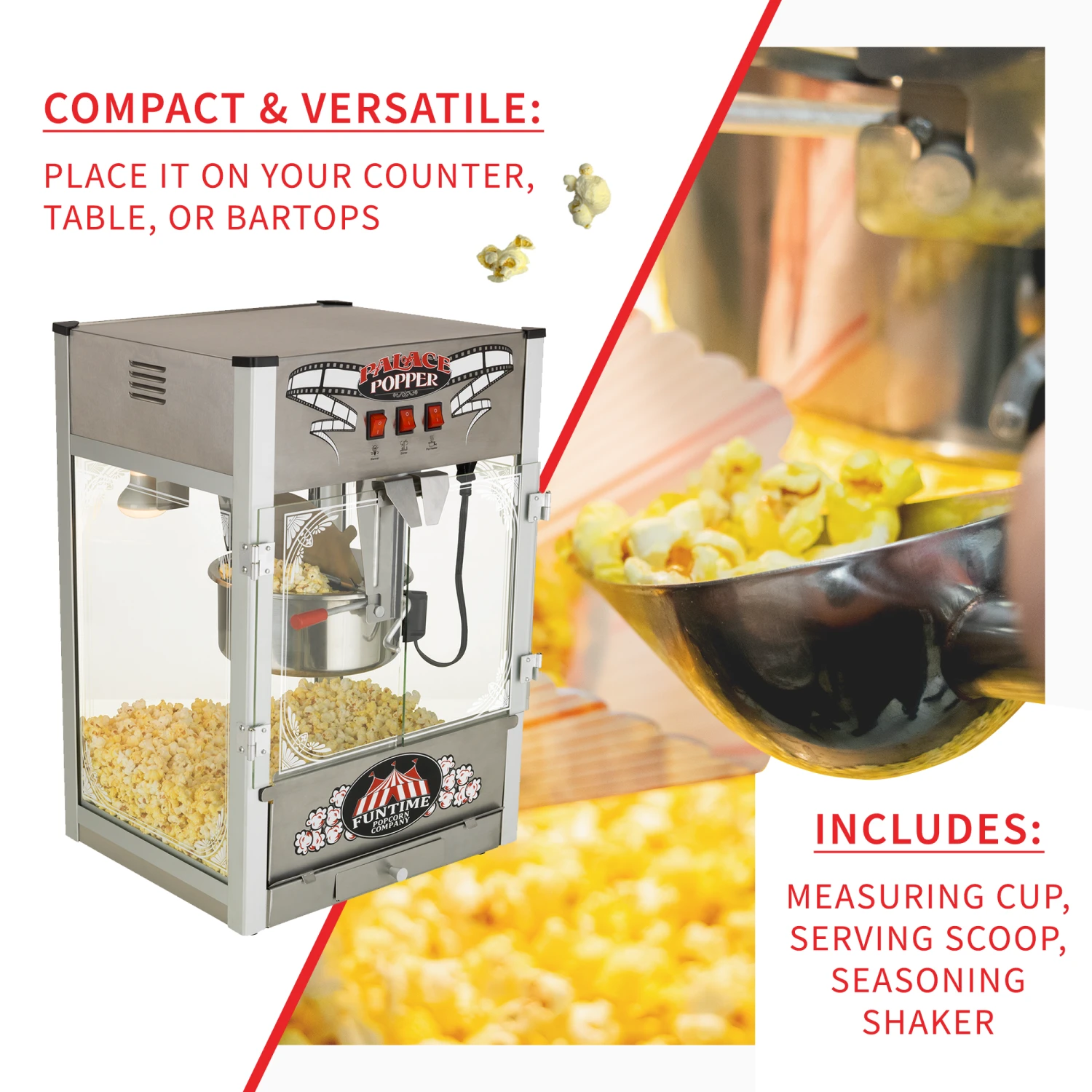 - BUILT FOR VERSATILITY: This popcorn machine can be placed on counters and bar/tabletops.
