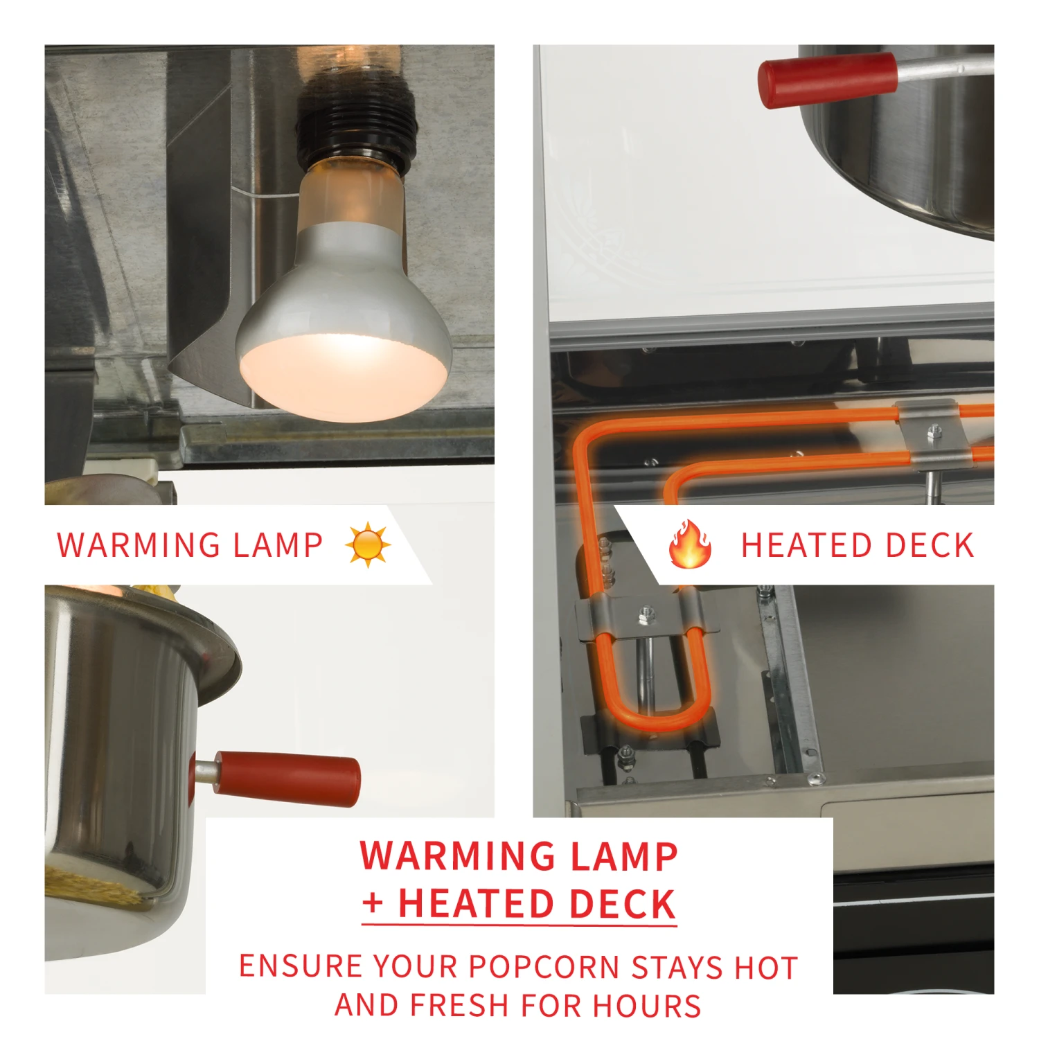 - WARMING LIGHT & HEATED DECK: Keeps the interior of the machine at a constant temperature to ensure your popcorn stays hot and fresh for hours.