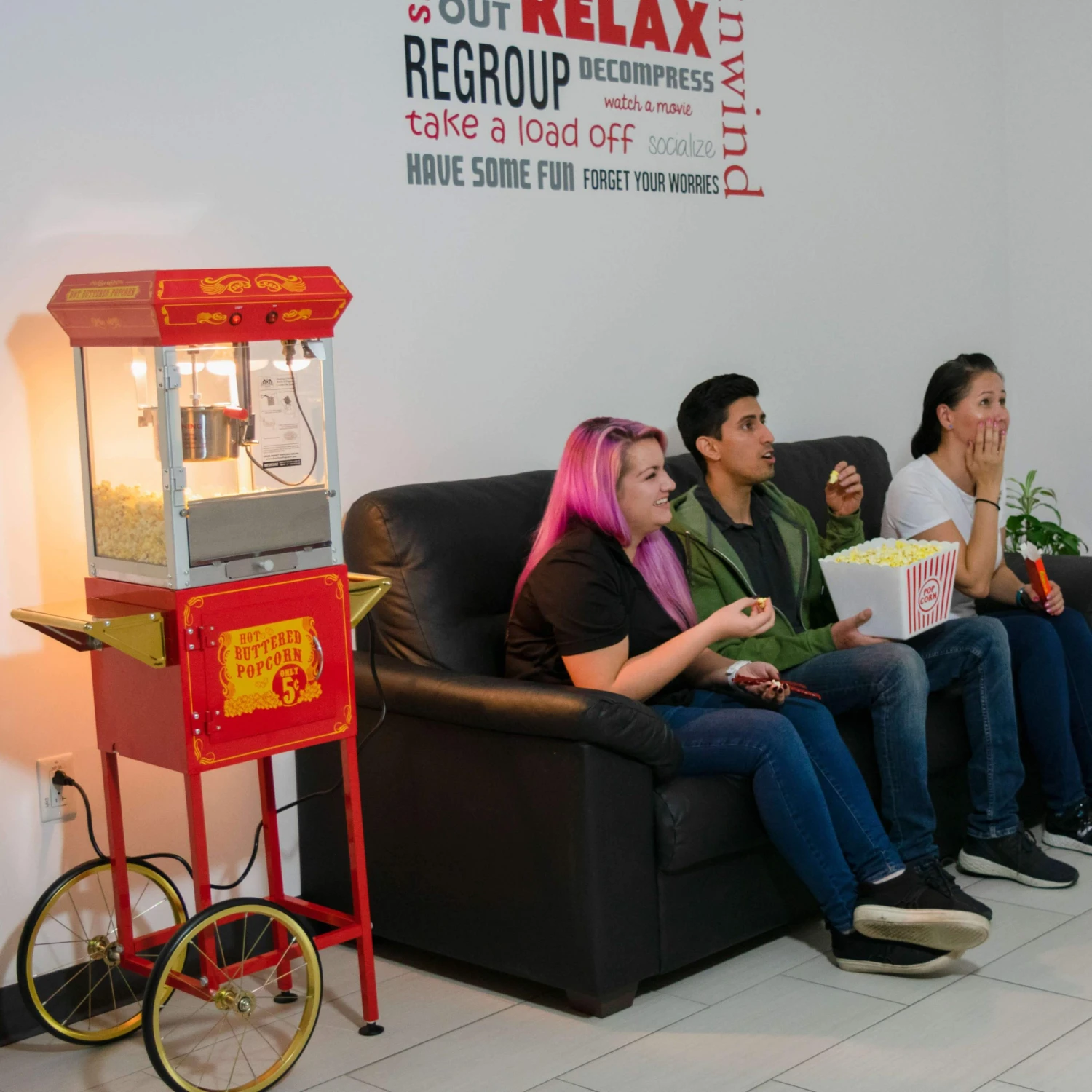 With our popcorn machines, hot dog rollers,