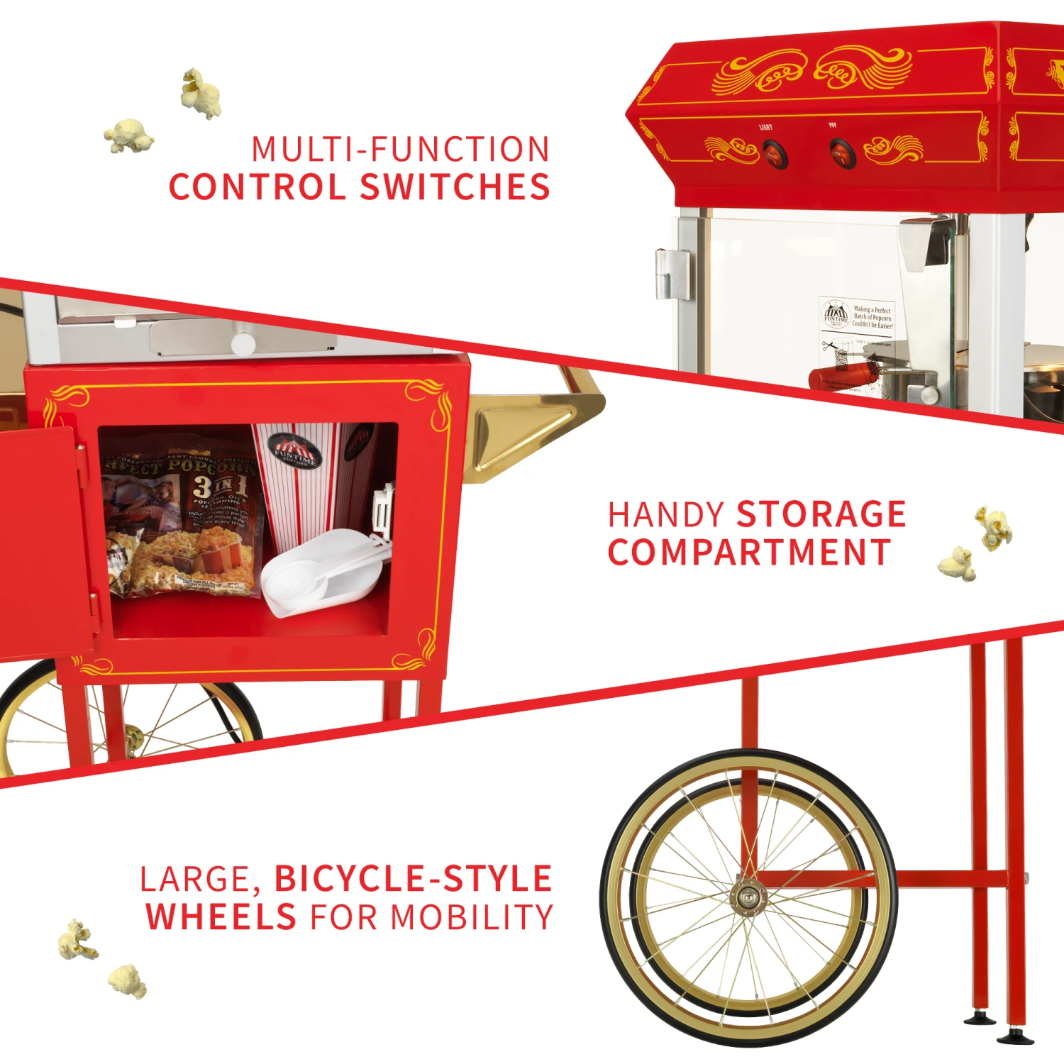 - BUILT FOR MOBILITY & VERSATILITY: Large, bicycle-style wheels allow for smooth mobility and easy portability. This model can be used with or without the cart — the popcorn machine is detachable and can be placed on counters and bar/tabletops.