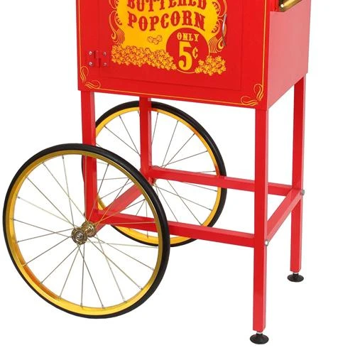 - BUILT FOR MOBILITY & VERSATILITY: Large, bicycle-style wheels allow for smooth mobility and easy portability. This model can be used with or without the cart — the popcorn machine is detachable and can be placed on counters and bar/tabletops.