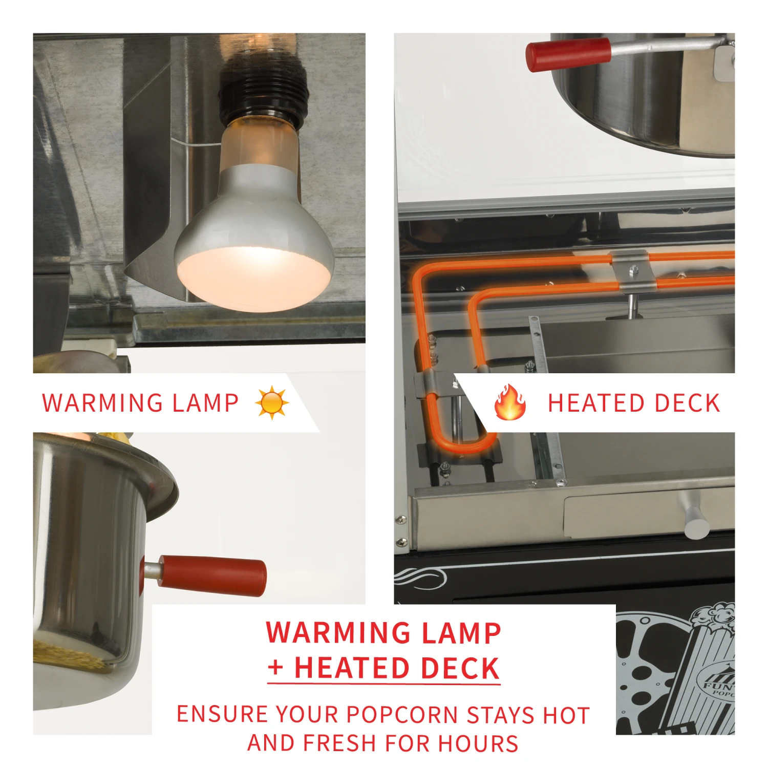 - WARMING LIGHT & HEATED DECK: Keeps the interior of the machine at a constant temperature to ensure your popcorn stays hot and fresh for hours.