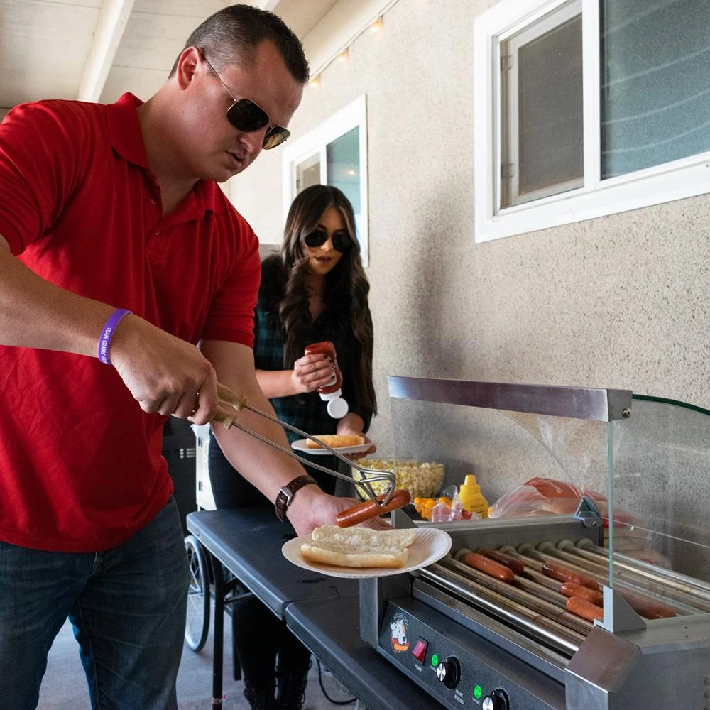 - Featuring 9 stainless steel rollers, this hot dog grill ensures even cooking and easy operation, making it ideal for restaurants, concession stands, and events.