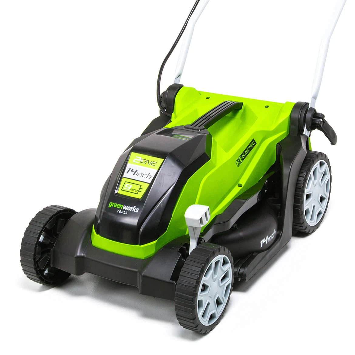 - The GreenWorks MO09B01 14-Inch Electric Lawn Mower is powered by a 9-amp motor, delivering reliable performance for small to medium-sized lawns.