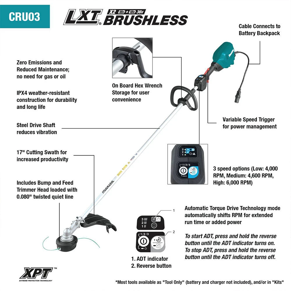 - Experience powerful and efficient lawn care with the Makita CRU03Z 36V Brushless String Trimmer. Designed for precision trimming and edging, this tool is a must-have for landscaping professionals and homeowners alike.