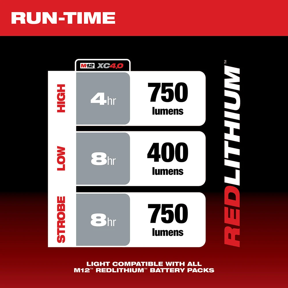 - Strobe Mode: 800 lumens for up to 8 hours with M12 XC 4.0 Pack