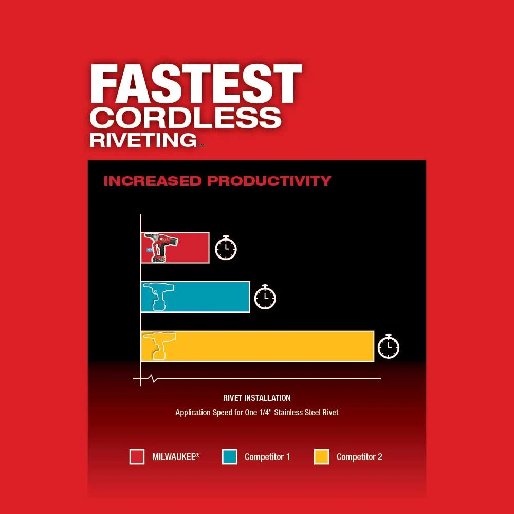 - Installs up to 500 1/4″ aluminum blind rivets on one REDLITHIUM CP2.0 battery charge