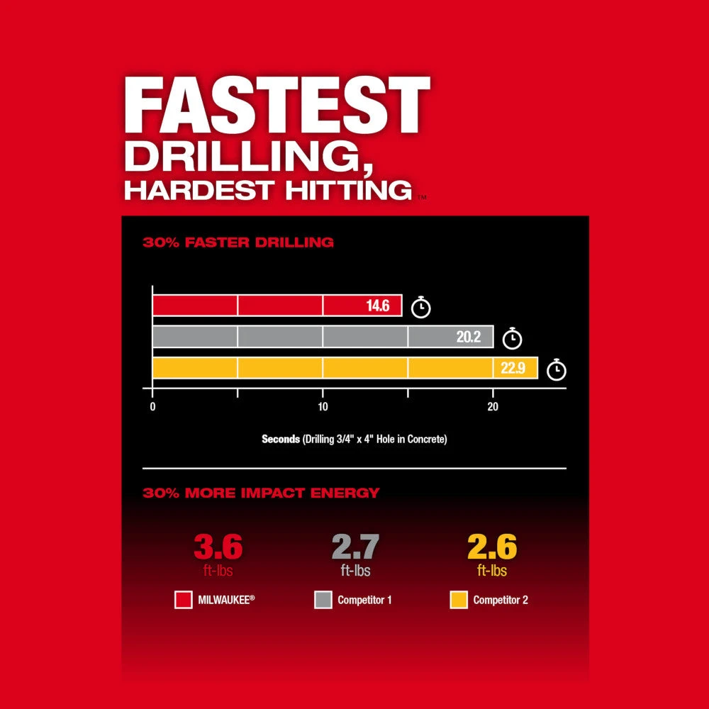 - Backed by Milwaukee’s reputation for durability and innovation, this rotary hammer is built to withstand the toughest job site conditions, ensuring long-lasting reliability.