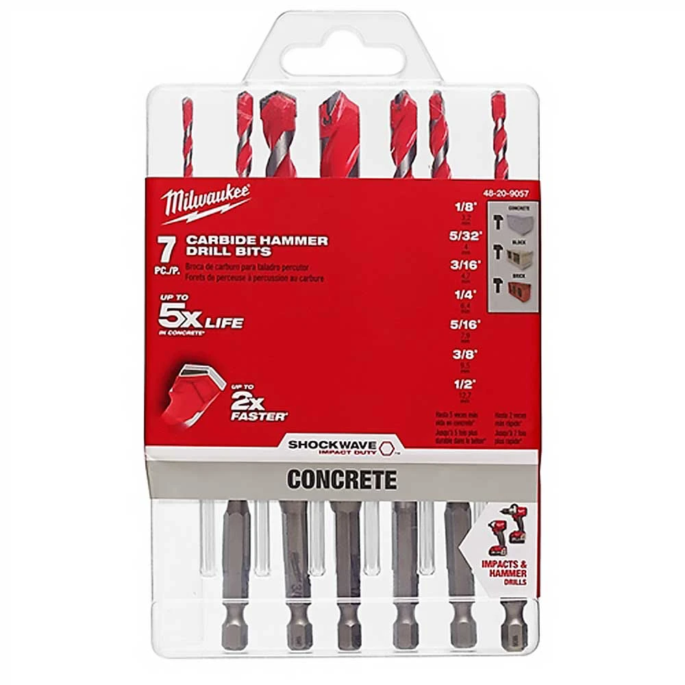 - The Milwaukee 48-20-9057 SHOCKWAVE Hex Shank Large Carbide Hammer Bit Kit includes 7 high-quality bits designed for heavy-duty drilling and hammering tasks.