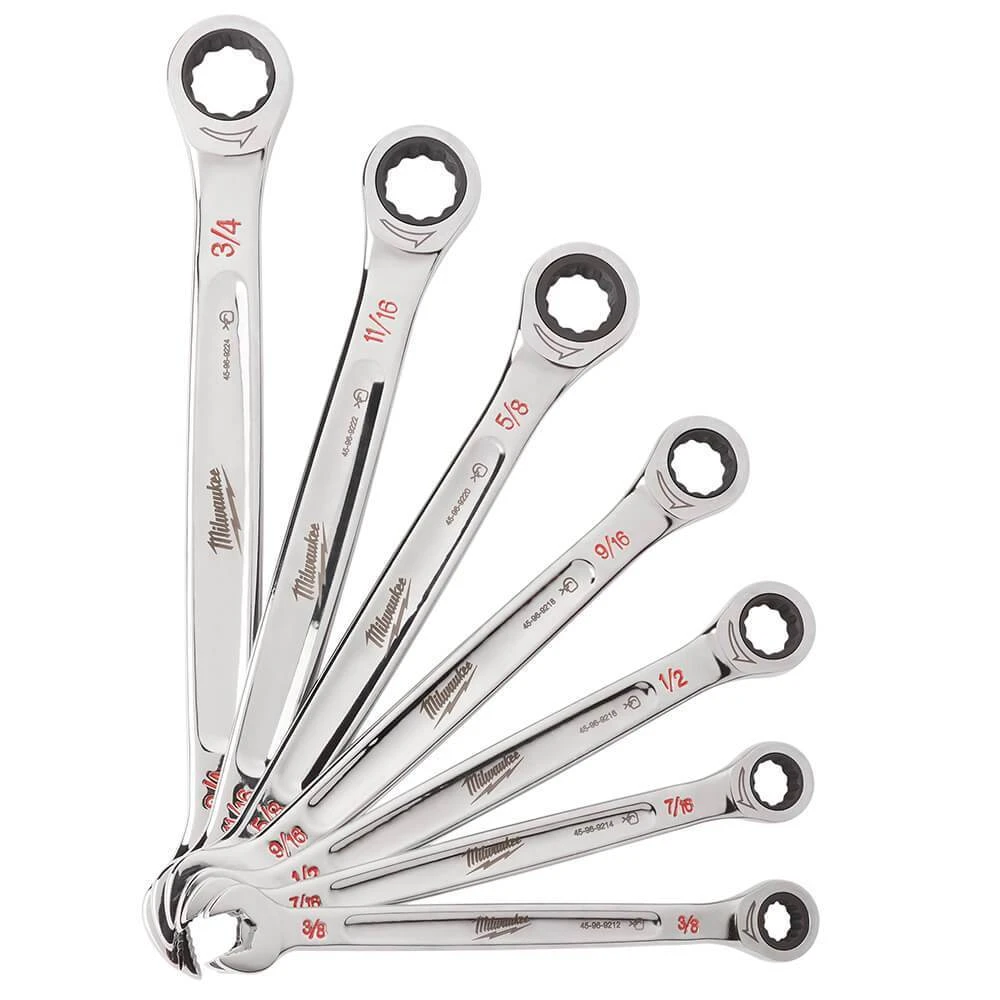 - The Milwaukee 48-22-9406 SAE Ratcheting Combination Wrench Set includes 7 durable wrenches, designed for precision and strength in tight spaces.