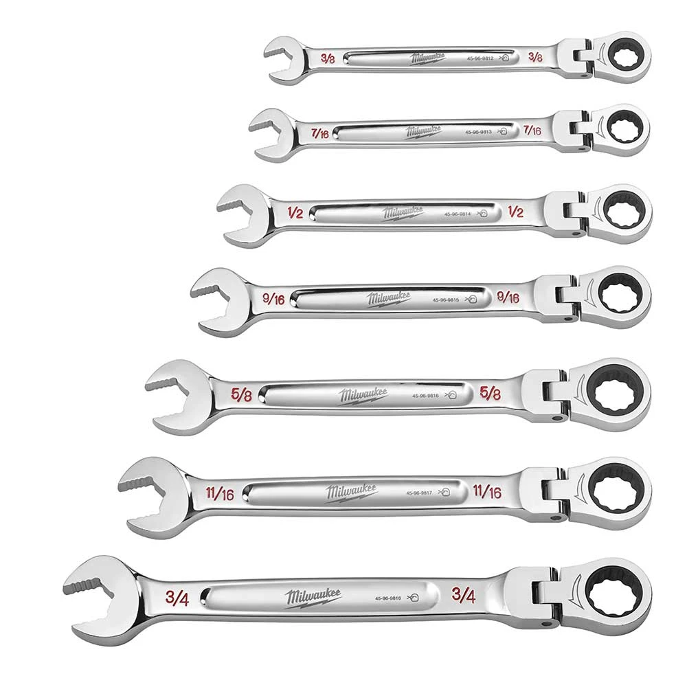 - The Milwaukee 48-22-9429 Flex Head Ratcheting SAE Combination Wrench Set includes 7 high-quality wrenches, perfect for a wide range of mechanical tasks.
