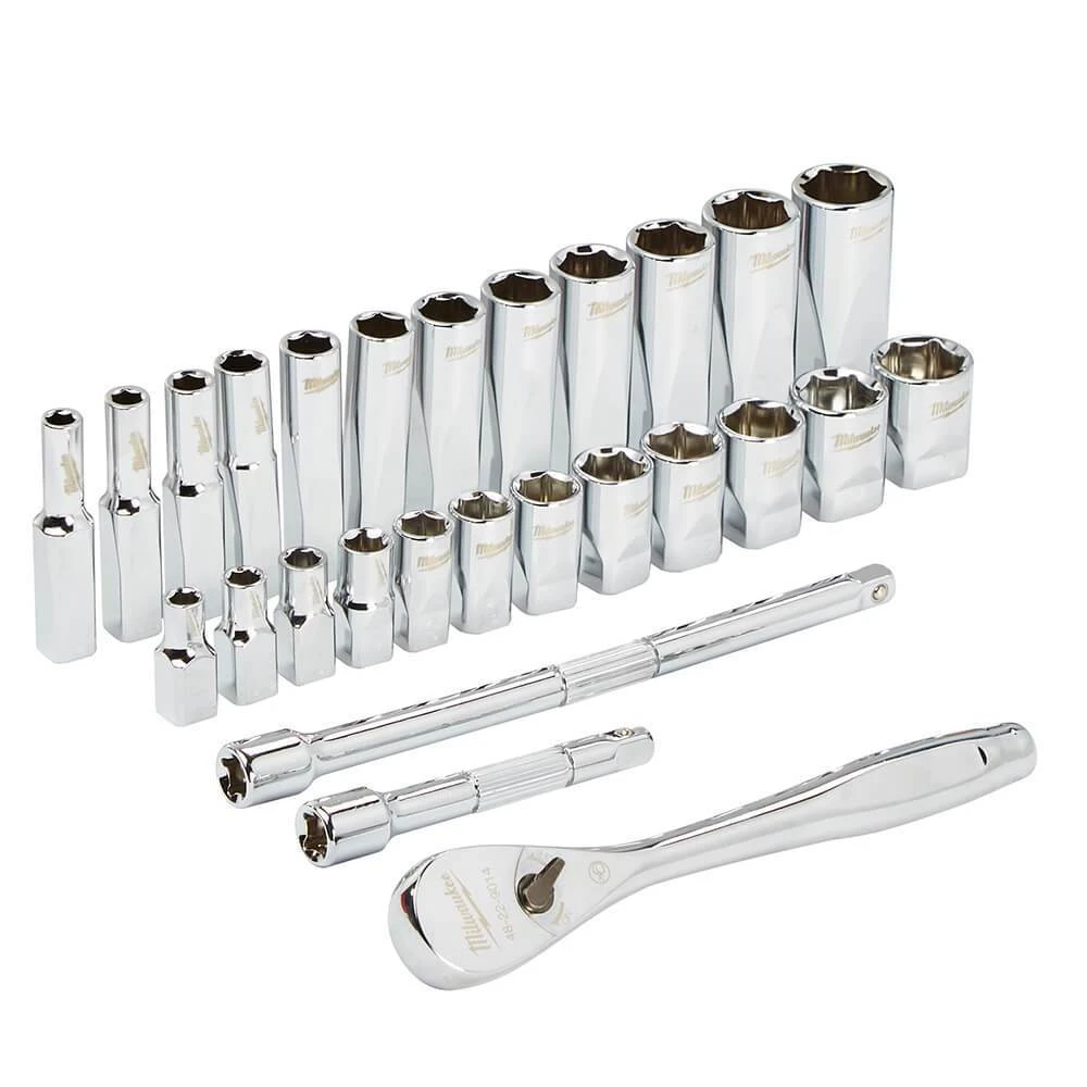 - The Milwaukee 48-22-9504 1/4-Inch Drive Metric Ratchet and Socket Set includes 28 essential pieces, designed for durability and precision in automotive and mechanical applications.
