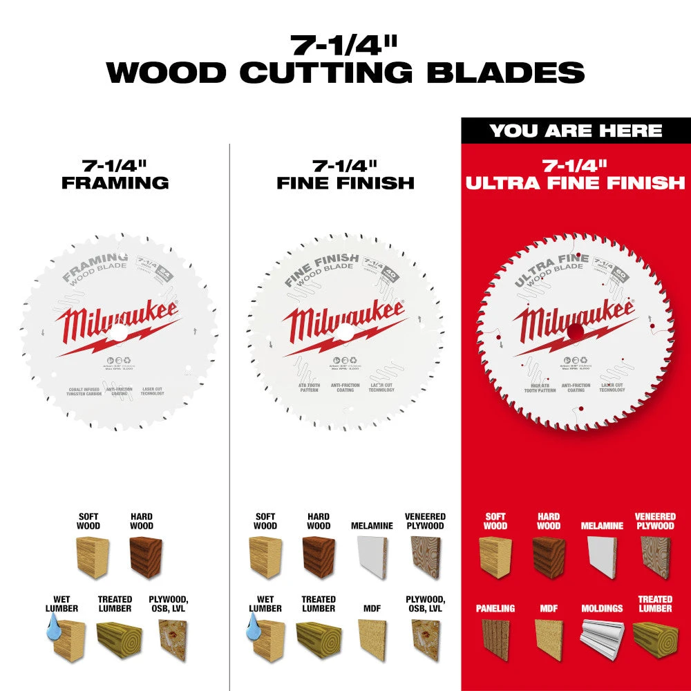 - Experience superior cutting performance with the Milwaukee 48-40-0730 7-1/4″ 60T Ultra Fine Finish Circular Saw Blade. Perfect for fine woodworking and detailed projects.