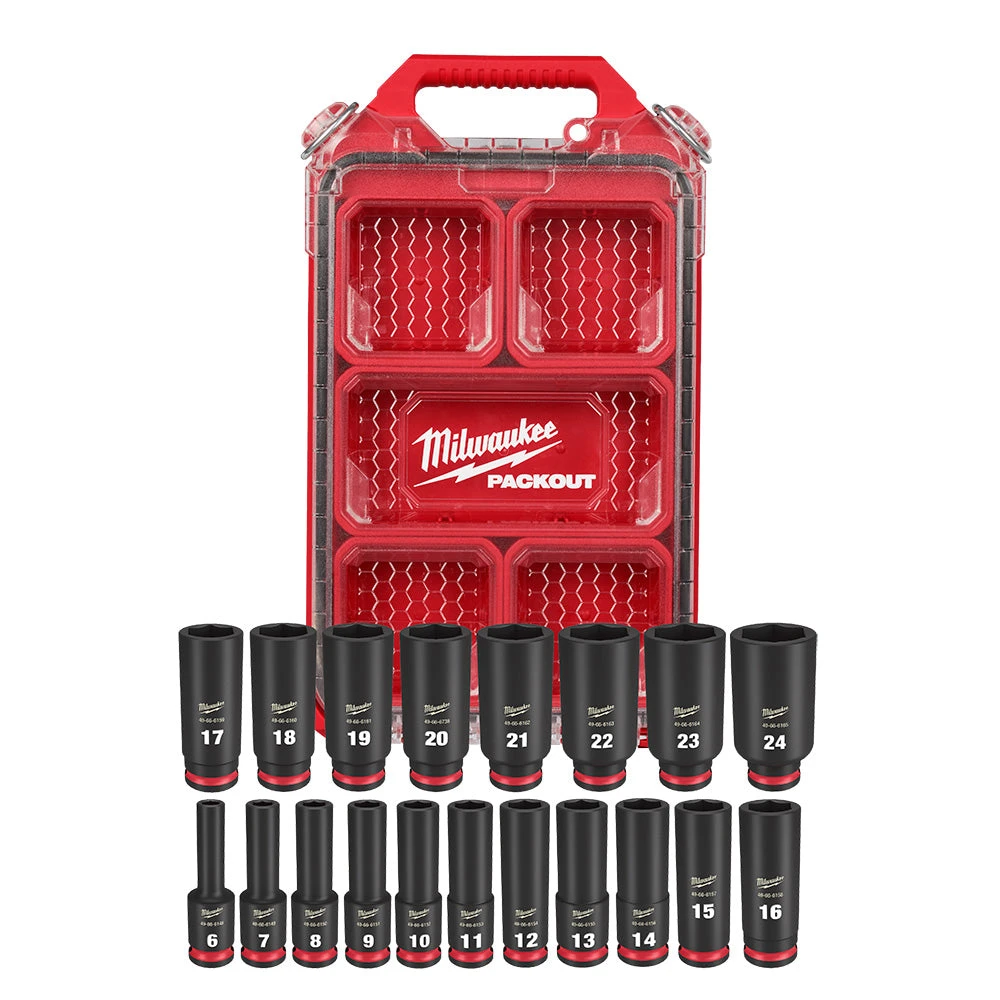 - The Milwaukee 49-66-6801 SHOCKWAVE 3/8” Impact Duty Socket MM PACKOUT Set includes 19 high-quality sockets designed for heavy-duty automotive and mechanical applications.