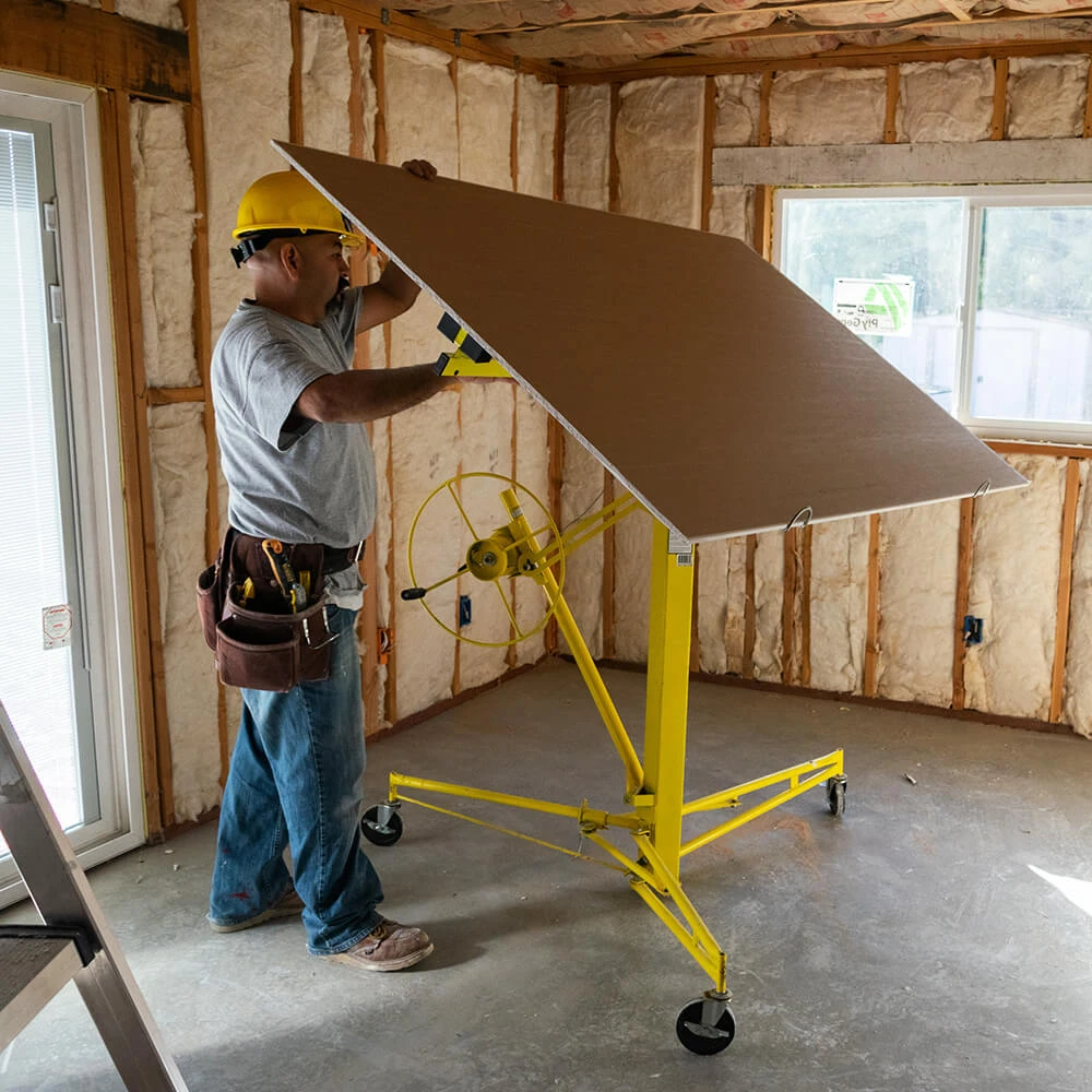 - Enjoy smooth operation and secure lifting with the durable steel frame and reinforced lifting mechanism, which can support up to 150 lbs of drywall weight.