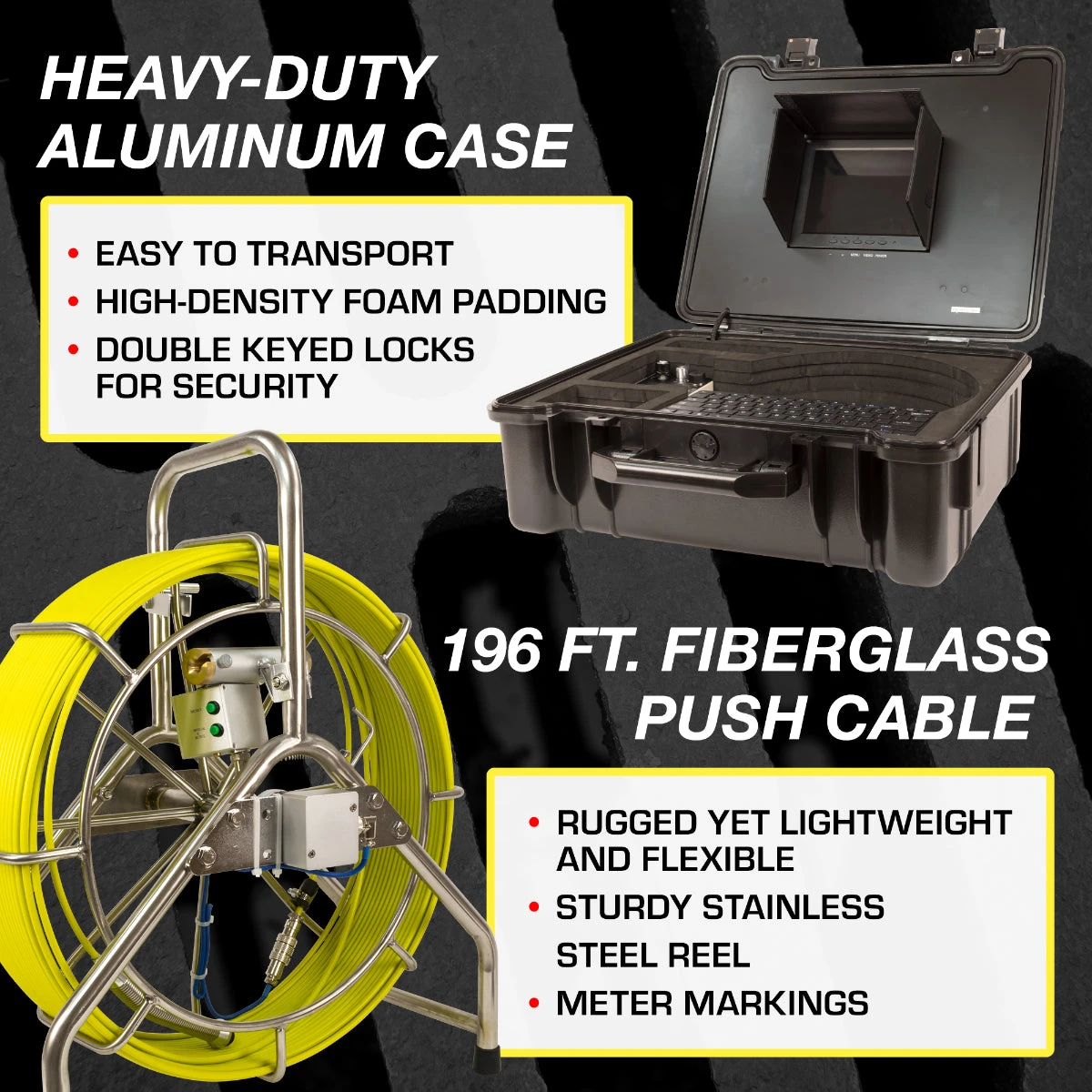 - The extra-long 196 ft. fiberglass push cable is rugged yet flexible and lightweight. Meter markings are included on the cable for precise measurements. The sturdy stainless steel reel ensures everything stays secure, while the large wheels allow for easy mobility.
