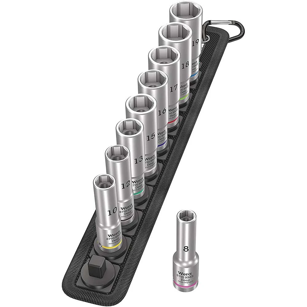 - The Wera 05004545001 Belt B 3/8″ Drive Deep Socket Set includes 9 high-quality sockets, designed for durability and precision in automotive and mechanical applications.