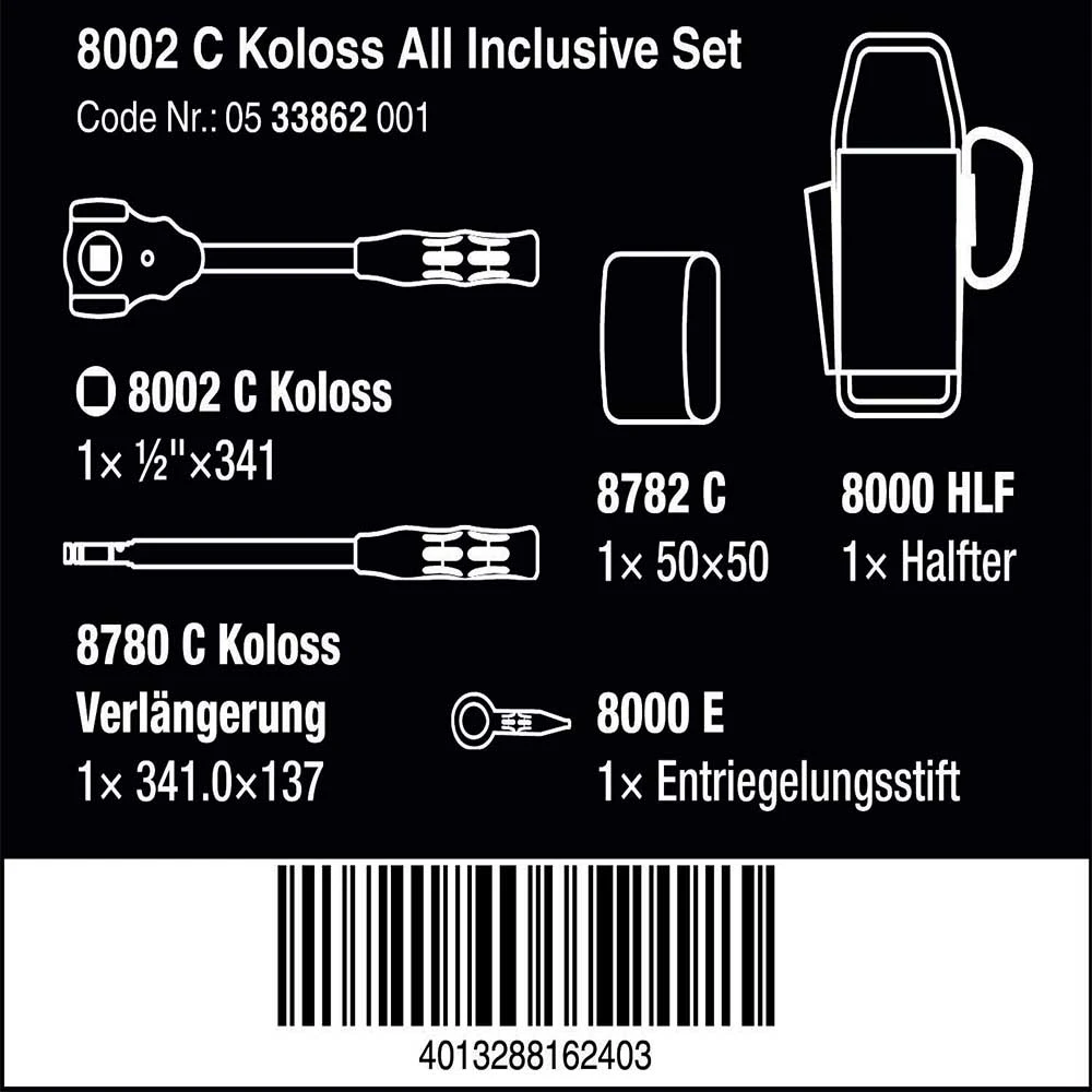 - The Wera 05133862001 8002 C Koloss 1/2″ Drive All Inclusive Ratchet Set includes 5 essential pieces, designed for maximum performance and durability in demanding work environments.